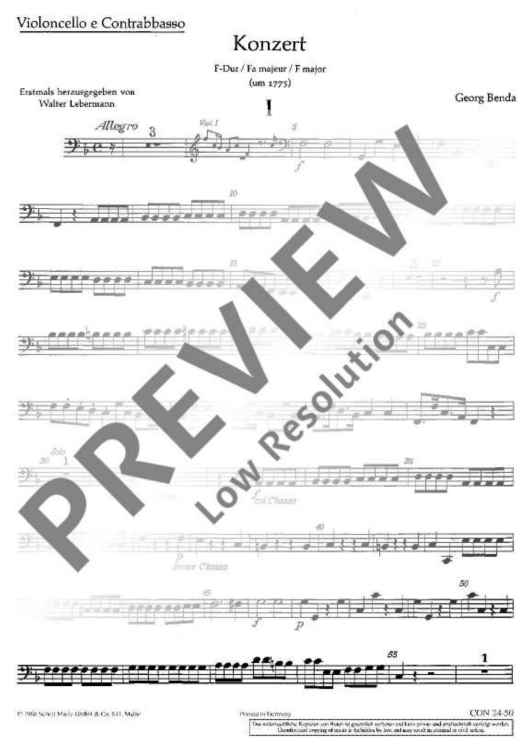 Digital Sheet Music for Concerto F Major - Violoncello/double Bass Rip. by Friedrich Wilhelm Heinrich Benda scored for Viola And Strings With Harpsichord; 2 Horns Ad Libitum; id:487840
