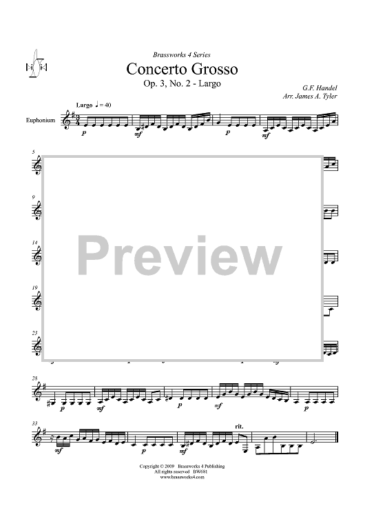 Digital Sheet Music for Concerto Grosso, Op. 3, No. 2 - Largo - Euphonium by George Frideric Handel, James A. Tyler scored for Brass Quartet; id:411364