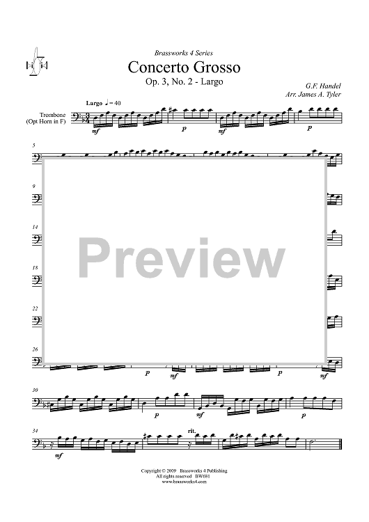 Digital Sheet Music for Concerto Grosso, Op. 3, No. 2 - Largo - Trombone (opt. F Horn) by George Frideric Handel, James A. Tyler scored for Brass Quartet; id:411363