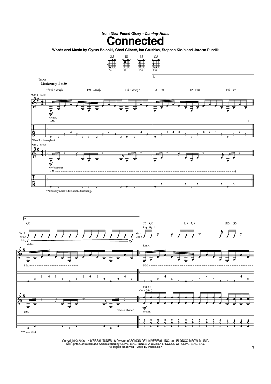 Digital Sheet Music for Connected by New Found Glory, Cyrus Bolooki, Chad Gilbert, Ian Grushka, Steve Klein, Jordan Pundik scored for Guitar Tab; id:397796