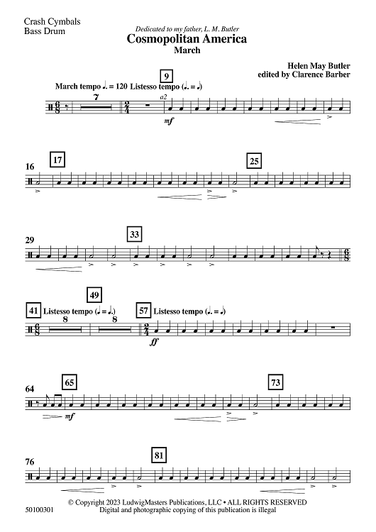 "Cosmopolitan America - Crash Cymbals / Bass Drum" Sheet Music by Helen May Butler