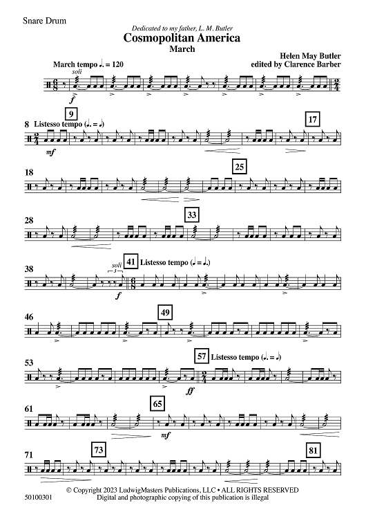 Digital Sheet Music for Cosmopolitan America - Snare Drum by Clarence Barber, Helen May Butler scored for Concert Band; id:509138