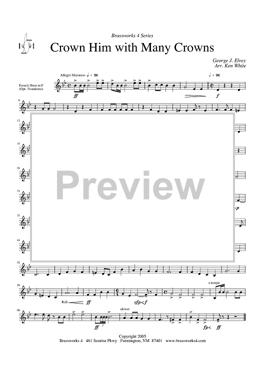 Digital Sheet Music for Crown Him with Many Crowns - Horn in F by George J. Elvey, Ken White scored for Brass Quartet; id:316698