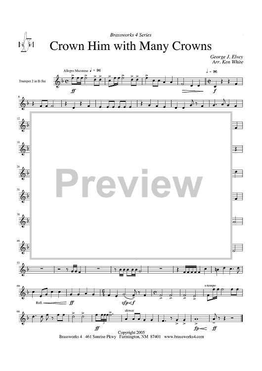 Digital Sheet Music for Crown Him with Many Crowns - Trumpet 2 by George J. Elvey, Ken White scored for Brass Quartet; id:316696