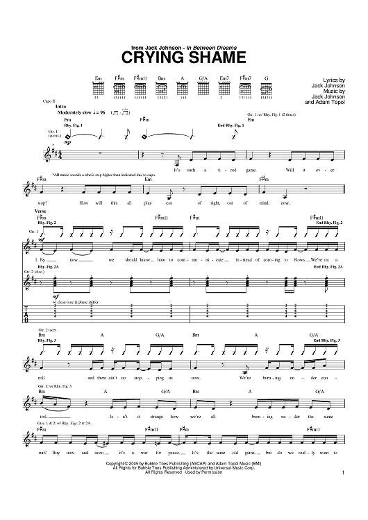 Digital Sheet Music for Crying Shame by Jack Johnson, Adam Topol scored for Guitar Tab; id:384994