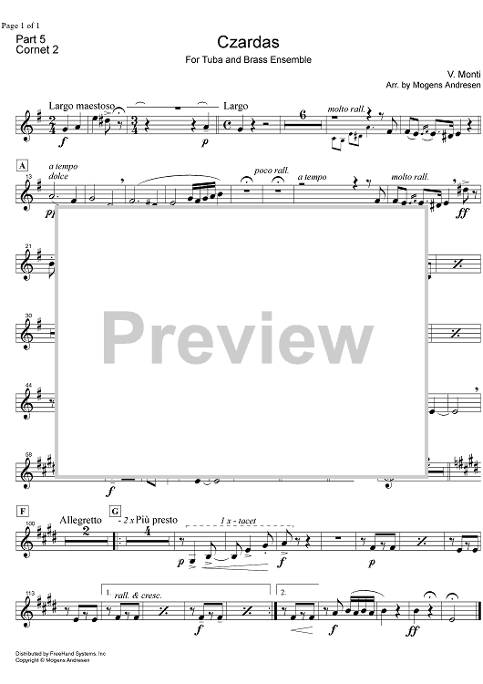 Digital Sheet Music for Czardas - B-flat Cornet 2 by Mogens Andresen, Vittorio Monti scored for Brass Ensemble; id:322210