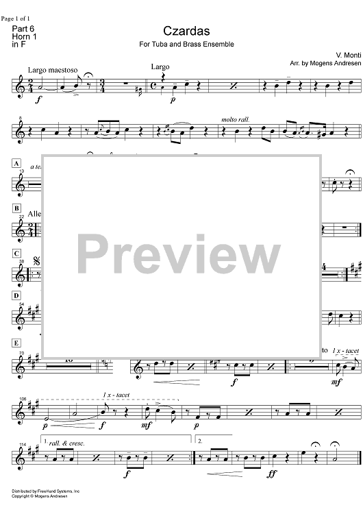Digital Sheet Music for Czardas - Horn in F 1 by Mogens Andresen, Vittorio Monti scored for Brass Ensemble; id:322211