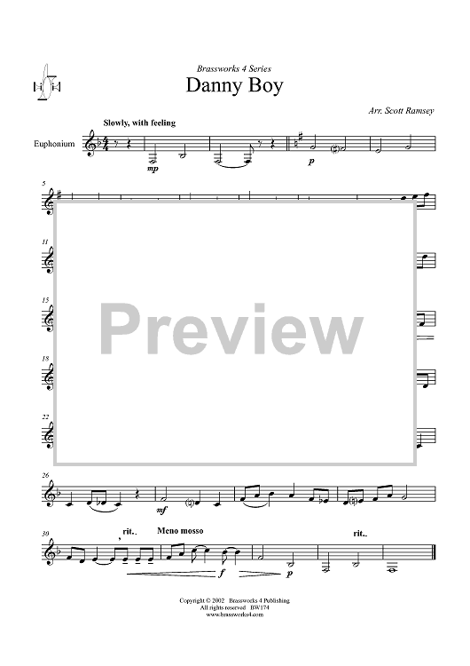 Digital Sheet Music for Danny Boy - Euphonium TC by Traditional Irish Melody, Scott Ramsey scored for Brass Quartet; id:428572