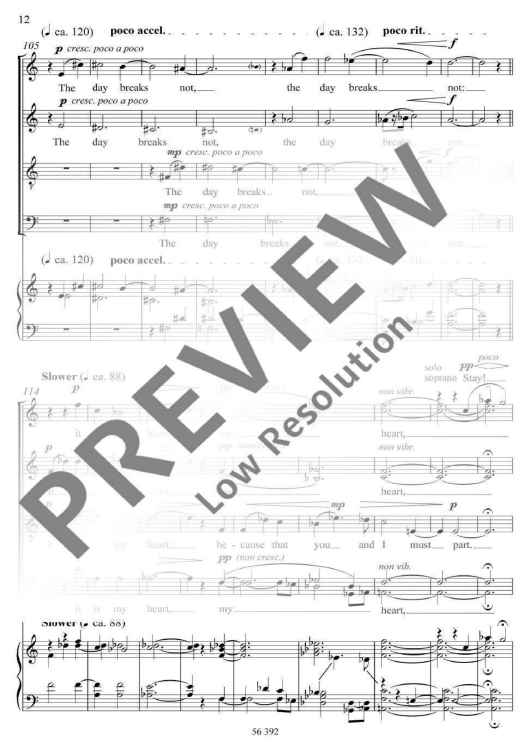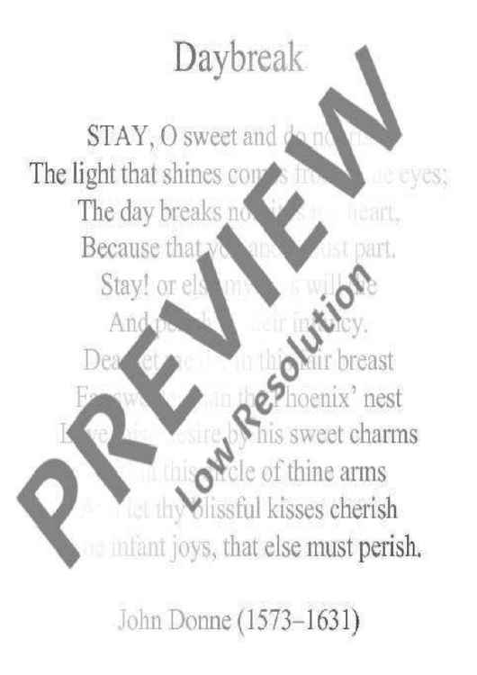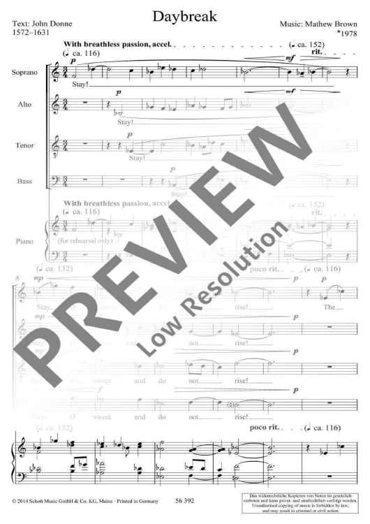 'Daybreak' is a 16th-century love poem set to music by Matthew Brown for four-part chamber choir. Harmonic frictions spice up the tonal image of romantic love.