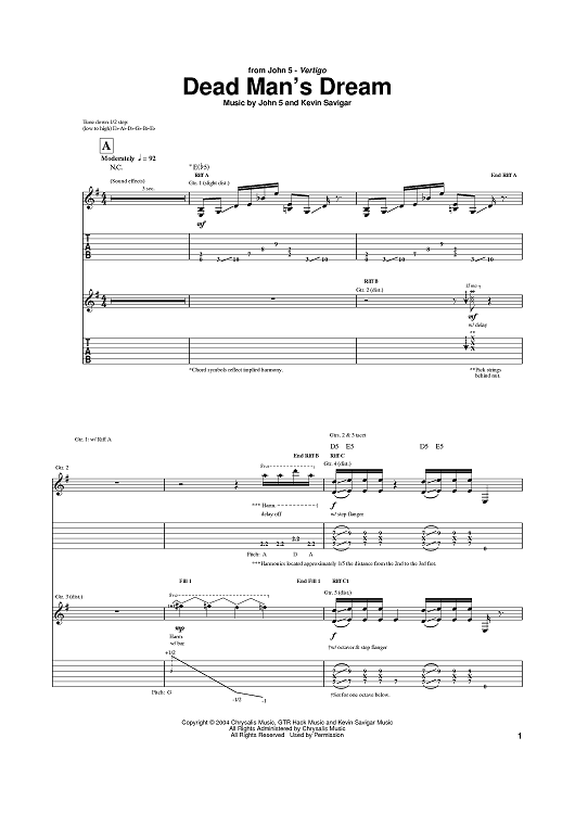 Digital Sheet Music for Dead Man's Dream by Kevin Savigar, John 5 scored for Guitar Tab; id:381033