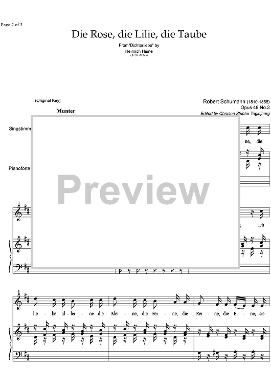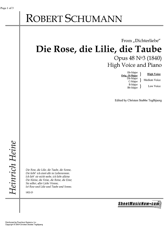 Digital Sheet Music for Die Rose, die Lilie, die Taube Op.48 No. 3 by , Robert Schumann scored for Soprano or Tenor/Piano; id:343337