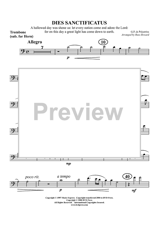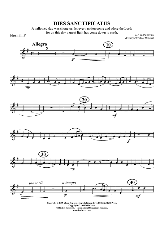 Digital Sheet Music for Dies Sanctus - Horn in F (plus optional part for Trombone) by Giovanni Pierluigi da Palestrina, Russ Howard scored for Brass Quartet; id:404675
