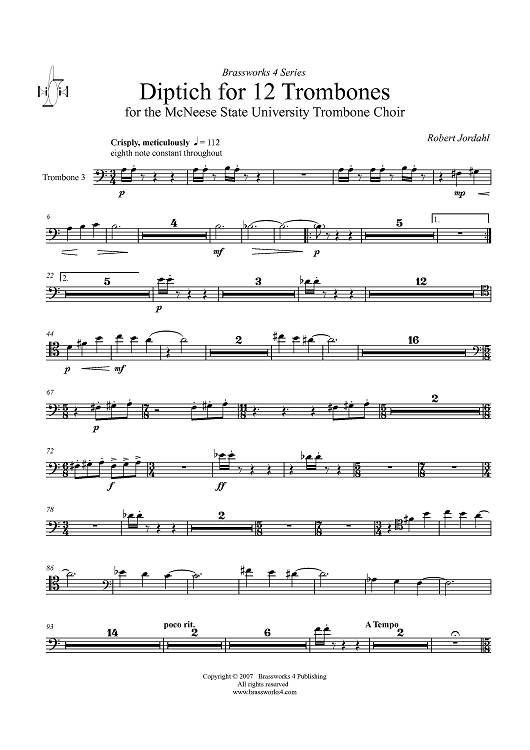 Digital Sheet Music for Diptich for Twelve Trombones - Trombone 3 by Robert Jordahl scored for Trombone Choir; id:363651