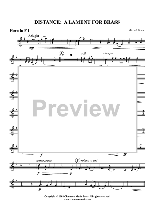 Digital Sheet Music for Distance: A Lament for Brass - Horn in F 1 by Michael Stewart scored for Brass Ensemble; id:417074