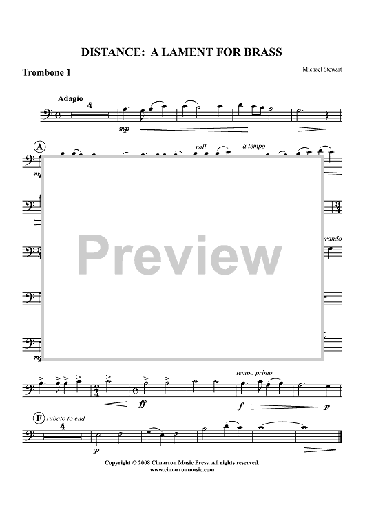 Digital Sheet Music for Distance: A Lament for Brass - Trombone 1 by Michael Stewart scored for Brass Ensemble; id:417079