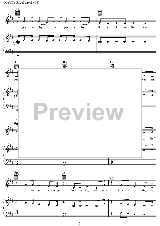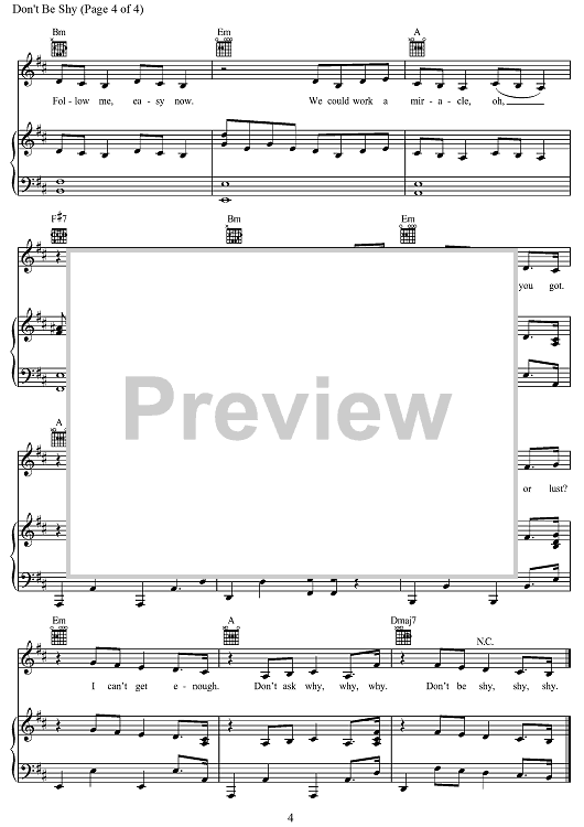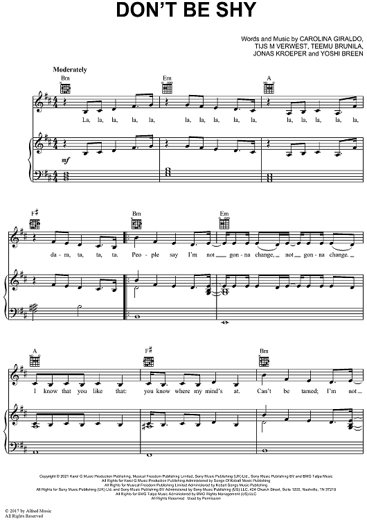 Digital Sheet Music for Don't Be Shy by Tijs Verwest, Tiësto, Kenny G, Karol G., Teemu Brunila, Jonas Kroeper, Yoshi Breen scored for Piano/Vocal/Chords; id:498424
