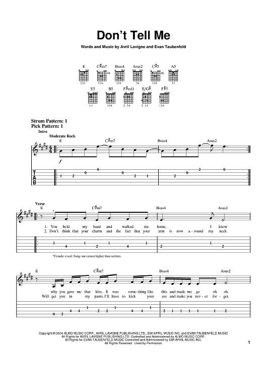 Digital Sheet Music for Don't Tell Me by Avril Lavigne, Evan Taubenfeld scored for Easy Guitar Tab; id:375371