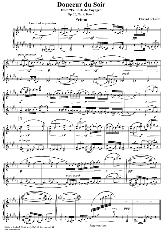 Digital Sheet Music for Douceur du Soir, No. 4 from "Feuillets de Voyage", Op. 26, Book 1 by Florent Schmitt scored for 1 Piano, 4 Hands; id:296008