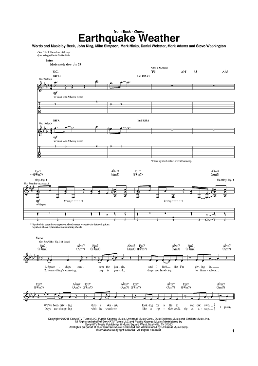 Digital Sheet Music for Earthquake Weather by John King, Mark Adams, Beck, Mark Hicks, Mike Simpson, Steve Washington, Daniel Webster scored for Guitar Tab; id:385192