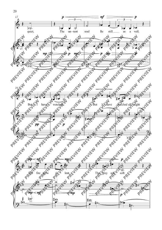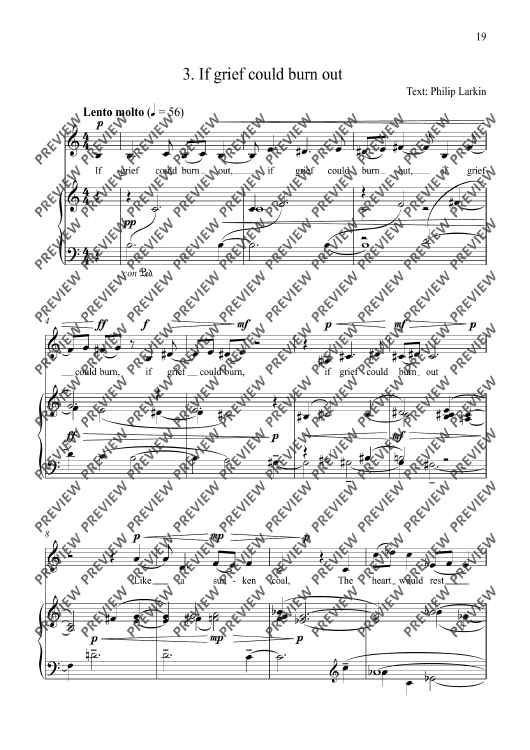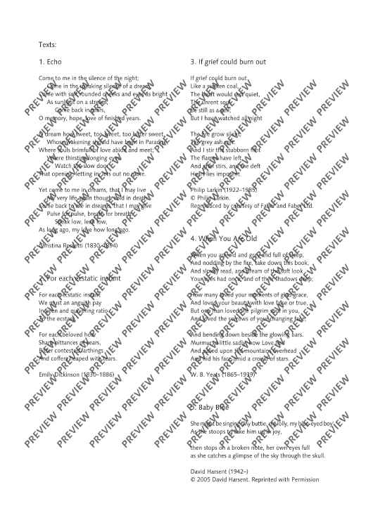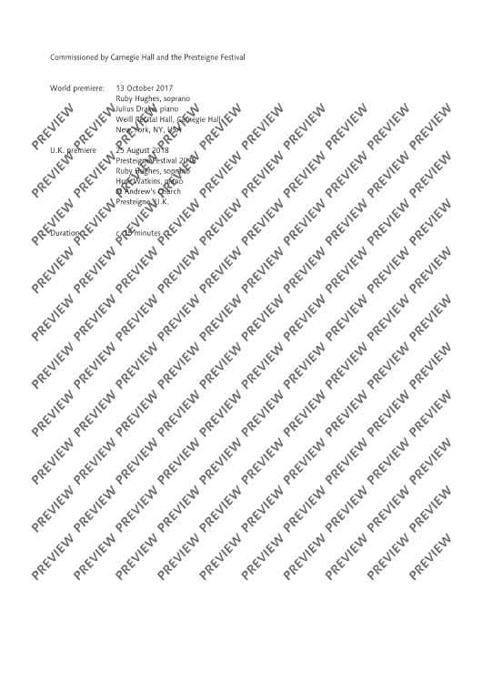Echo was written for Ruby Hughes, and given its premiere, with Julius Drake at the piano, at Carnegie Hall, New York, on 13 October 2017. It is the third piece (following my one-act opera In the Locked Room, and my song cycle with string orchestra, Remember) that I’ve written for Ruby’s exquisite voice, which was very much in my mind as I wrote the music. There are five songs altogether, beginning with a setting of Christina Rossetti’s ‘Echo’ which gives the cycle its title. After settings of Dickinson, Larkin and Yeats, the cycle ends with a short but searingly powerful poem by David Harsent. Echo was a co-commission between Carnegie Hall and the Presteigne Festival; it received its UK premiere on 25 August 2018 at St Andrew’s Church, Presteigne performed by Ruby Hughes and Huw Watkins.