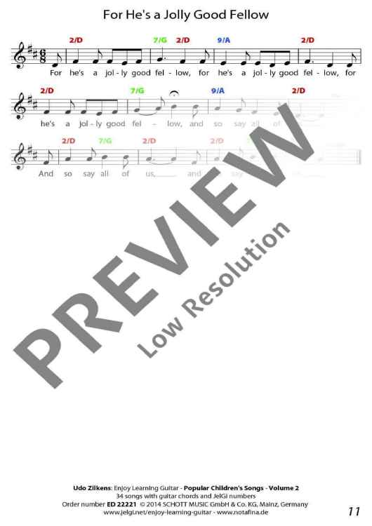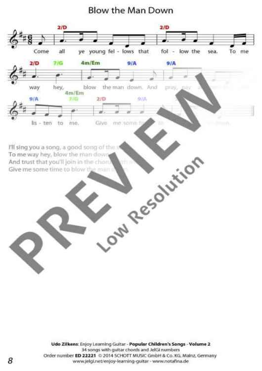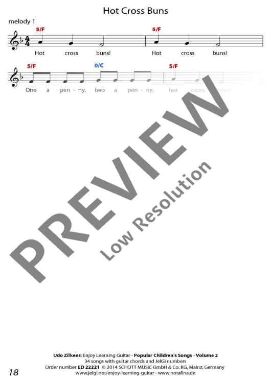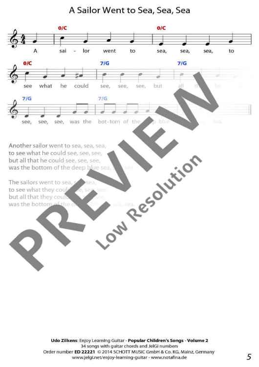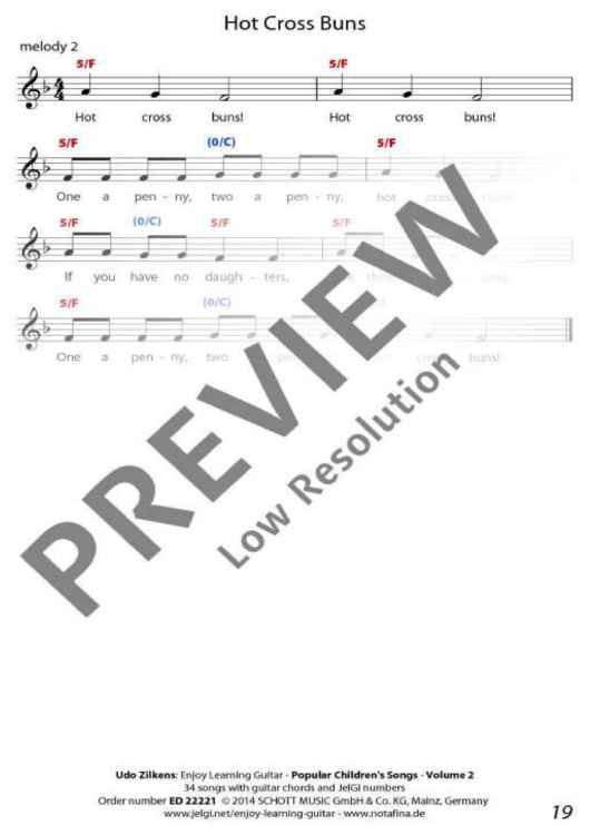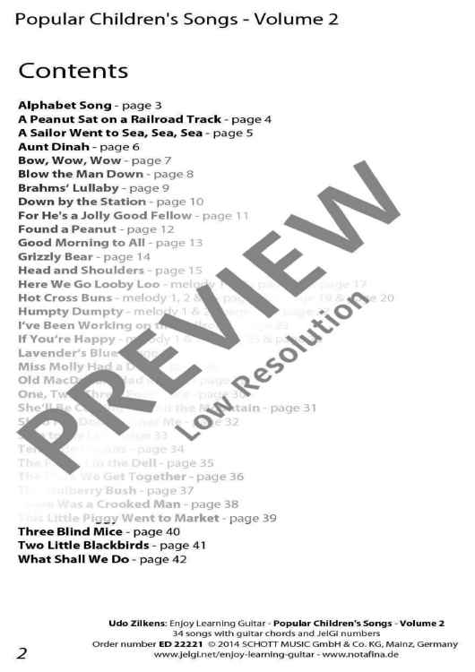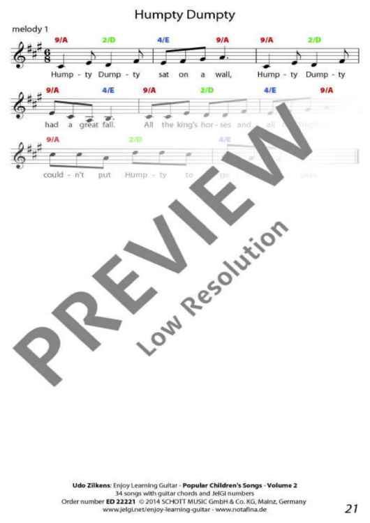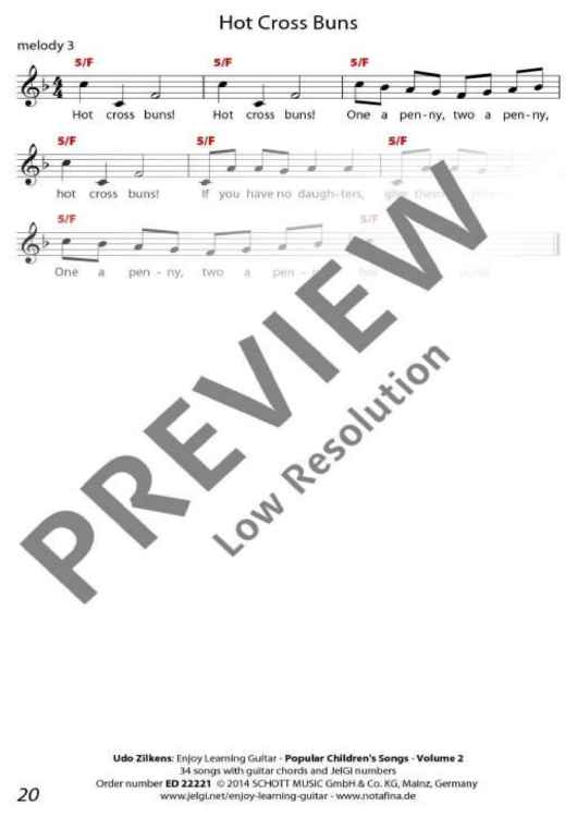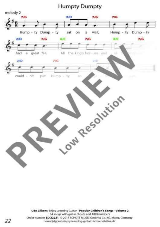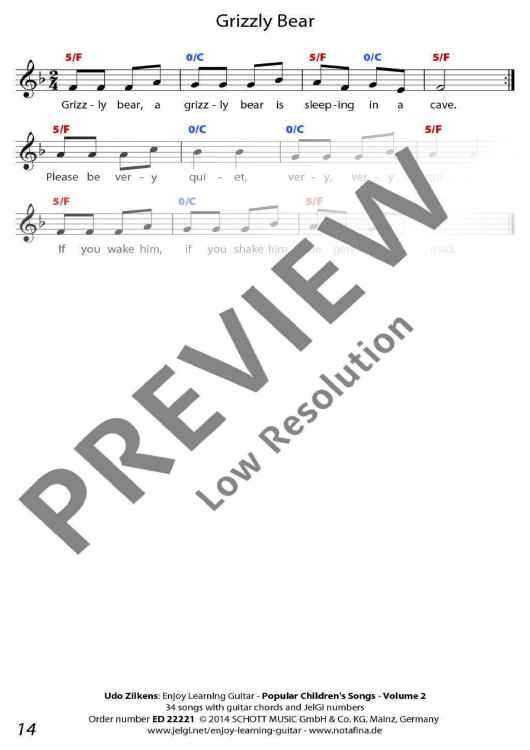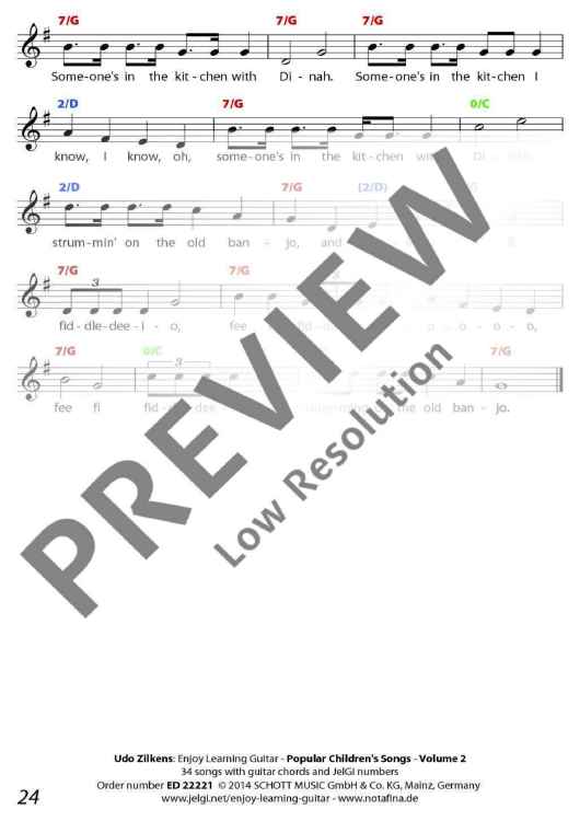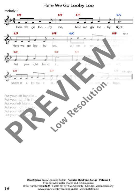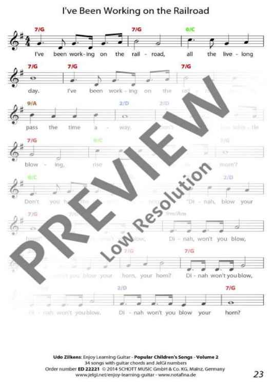 Sheet music titles for the JelGi method can be downloaded from www.notafina.de for both open JelGi tuning C-G-C-G-C-E and for traditional tuning E-A-D-G-B-E. All available song titles are listed online at www.jelgi.net/enjoy-learning-guitar.