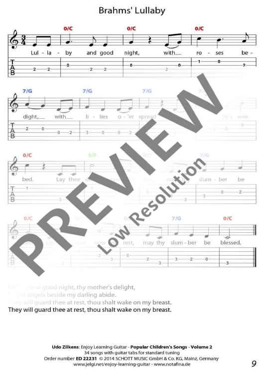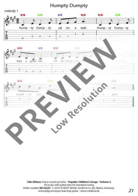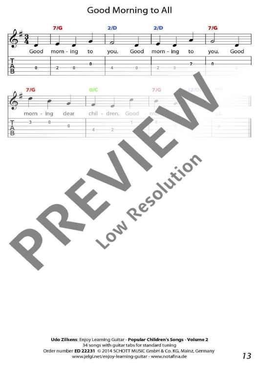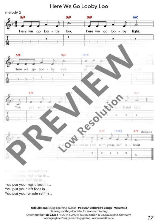 Sheet music titles for the JelGi method can be downloaded from www.notafina.de for both open JelGi tuning C-G-C-G-C-E and for traditional tuning E-A-D-G-B-E. All available song titles are listed online at www.jelgi.net/enjoy-learning-guitar.