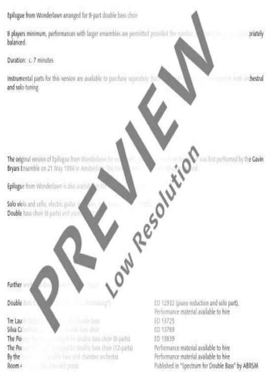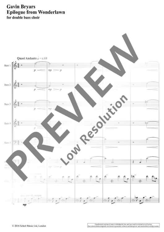 Written by double bass player Gavin Bryars, this arrangement is one of a series of works for double bass ensemble. Originally scored for viola, cello, double bass and electric guitar, Epilogue from Wonderlawn offers the perfect opportunity to experience the Bryars sound world.