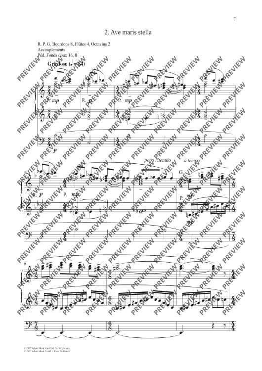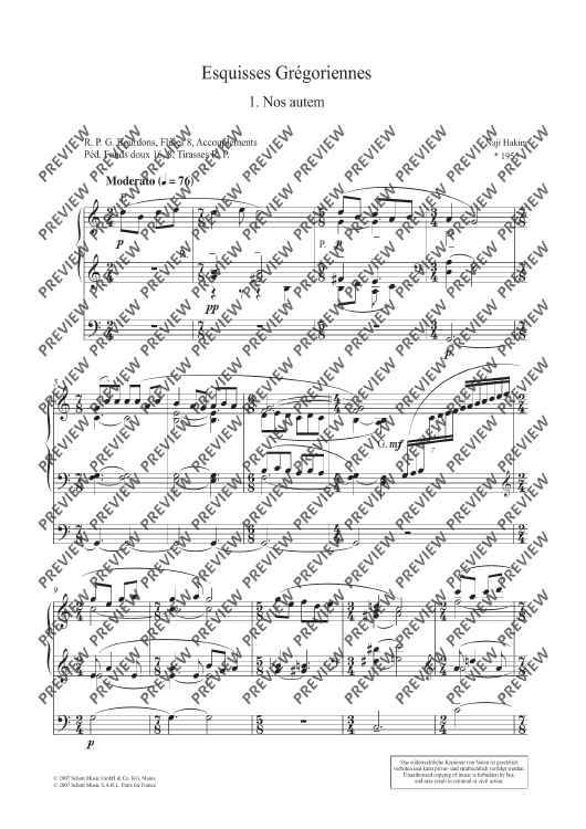 The five choral arrangements of 'Esquisses Grégoriennes' are based on the cantus firmus mentioned in each title. They can be integrated in the course of the mass as follows: 'Nos autem' at the entry, 'Ave maris stella' at the offertory, 'Pater noster' at the high prayer, 'Ave verum' at the communion, and 'Filii et Filiae' at the dismissal.