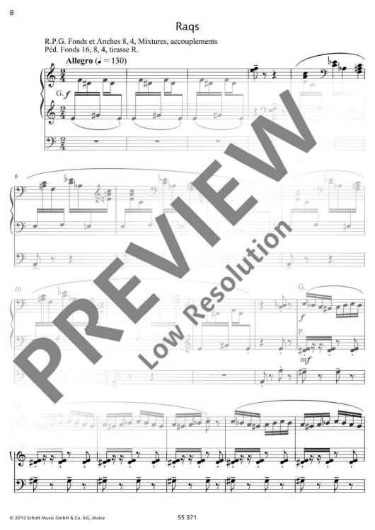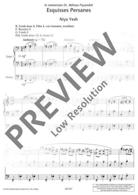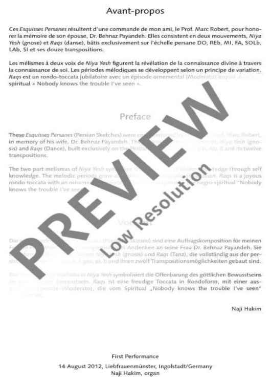 'Esquisses Persanes' (Persian Sketches) consists of the two movements 'Niya Yesh' (gnosis) and 'Raqs' (dance) which are based completely on the Persian scale C, D flat, E, F, G flat, A flat, B and their twelve transposition possibilities. The two-part melisma in 'Niya Yesh' symbolizes the revelation of the divine consciousness within the personal consciousness. 'Raqs' is a merry toccata in rondo form, with an embellished episode (moderato), which has been inspired by the spiritual 'Nobody knows the trouble I’ve seen'.