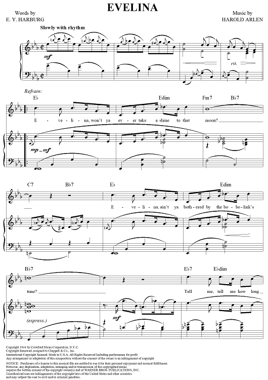 Digital Sheet Music for Evelina by Harold Arlen, E.Y. "Yip" Harburg scored for Piano/Vocal/Chords; id:355924