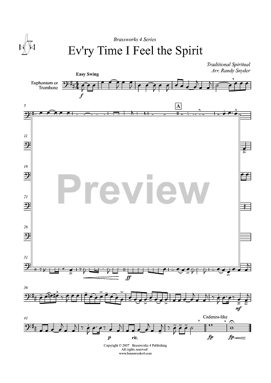Digital Sheet Music for Ev'ry Time I Feel the Spirit - Euphonium BC or Trombone by Traditional Spiritual, Randy Snyder scored for Brass Quartet; id:361048