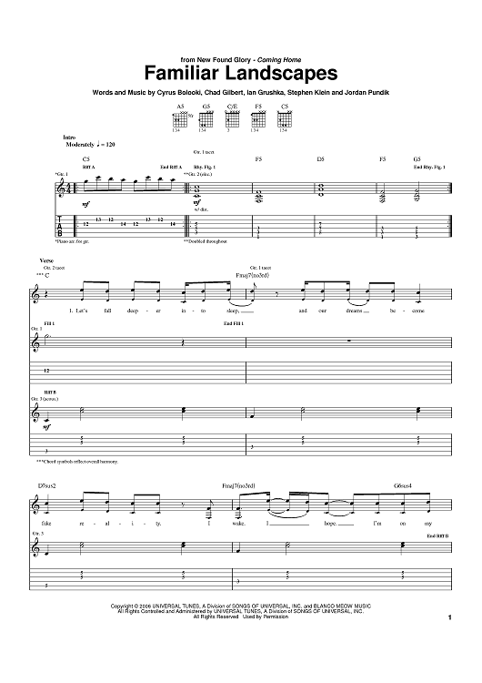 Digital Sheet Music for Familiar Landscapes by New Found Glory, Cyrus Bolooki, Chad Gilbert, Ian Grushka, Steve Klein, Jordan Pundik scored for Guitar Tab; id:397797