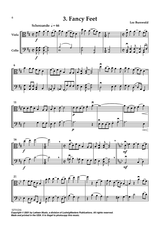 Advanced intermediate level, all bass clef for cello, some treble for viola. Contents: Spiritual, Autumn, Fancy Feet, Lament, Dance.