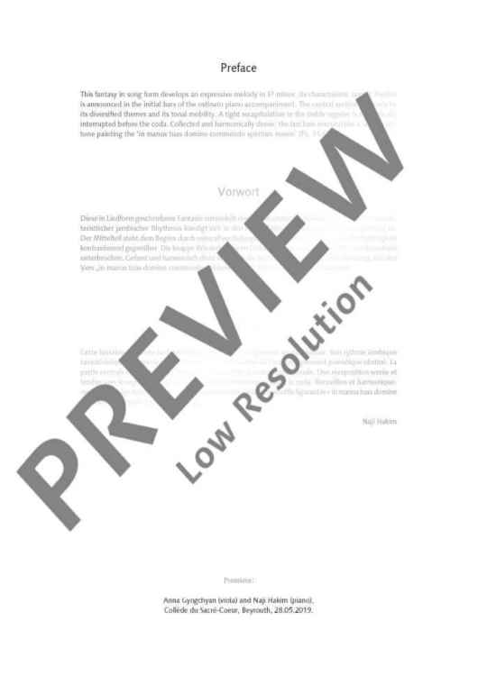 This fantasy in song form, develops an expressive melody in Eb minor. Its characteristic iambic rhythm is announced in the initial bars of the ostinato piano accompaniment. The central section contrasts by its diversified themes and its tonal mobility. A tight recapitulation in the treble register is dramatically interrupted before the coda. Collected and harmonically dense, the last bars resound like a last breath, tone painting the ‘in manus tuas domine commendo spiritum meum’ (Ps. 31,6).
