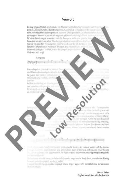Es mag ungewöhnlich erscheinen, ein Thema von Brahms für Trompete und Orgel zu setzen. Bei der Literatur für diese Besetzung denkt man eher an wirkungsvolle Brillanz als an Gedankentiefe, Kontrapunktik oder expressive Melodik. Doch gerade in der schöpferischen Auseinandersetzung mit Brahms’scher Musik ergab sich für den Komponisten Harald Feller die Möglichkeit, das Ausdrucksspektrum für diese Besetzung zu erweitern und der Trompete auch eine lyrische Seite abzugewinnen. Das thematische Material bildet das Thema der frühen Orgelfuge in as-Moll, der der junge Komponist bereits seine ganze kontrapunktische Meisterschaft zeigt. Die vorliegende „Fanstasie“ ist mit den Elementen dieses Themas, deren Umkehrung, Vergrößerung und Diminuition weitgehend sehr dicht kontrapunktisch gearbeitet. Es finden sich aber auch für jedes der beiden Instrumente eine kurze Kadenz mit der Möglichkeit einer gewissen Virtuosität und Freiheit. Die Passagen mit Dämpfer sind wiederum von äußerster melodischer Zartheit. (Auszug aus dem Vorwort)