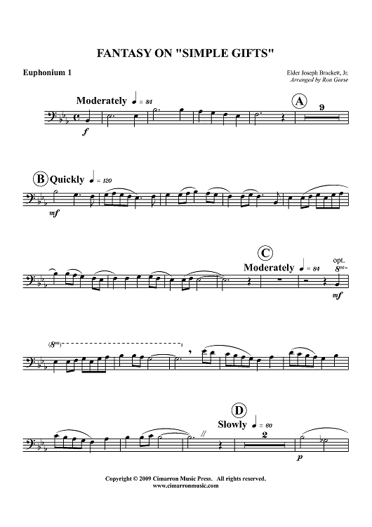 Digital Sheet Music for Fantasy on "Simple Gifts" - Euphonium 1 BC/TC by Ron Geese, Elder Joseph Brackett scored for Tuba Quartet; id:416347