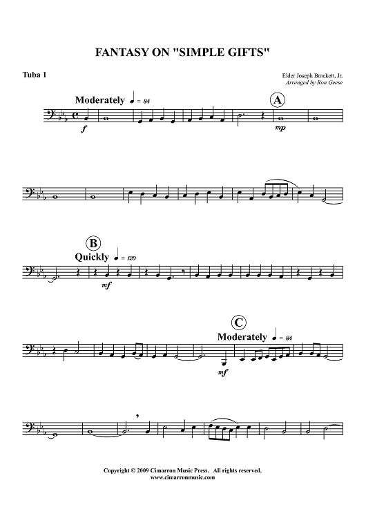 Digital Sheet Music for Fantasy on "Simple Gifts" - Tuba 1 by Ron Geese, Elder Joseph Brackett scored for Tuba Quartet; id:416349