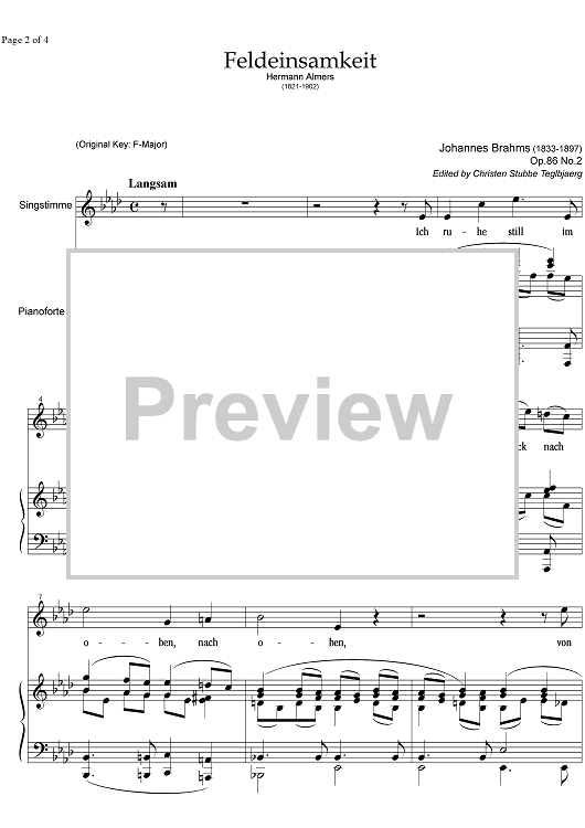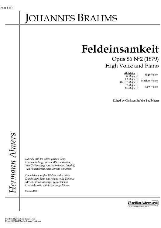 Digital Sheet Music for Feldeinsamkeit Op.86 No. 2 by , Johannes Brahms scored for Soprano or Tenor/Piano; id:331300
