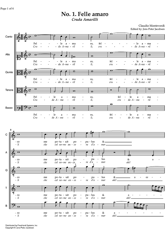 Digital Sheet Music for Felle Amaro - Cruda Amarilli by , Claudio Monteverdi scored for SATB Choir; id:326510