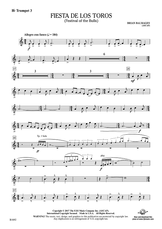 Digital Sheet Music for Fiesta de los Toros - Bb Trumpet 3 by Brian Balmages scored for Concert Band; id:510310