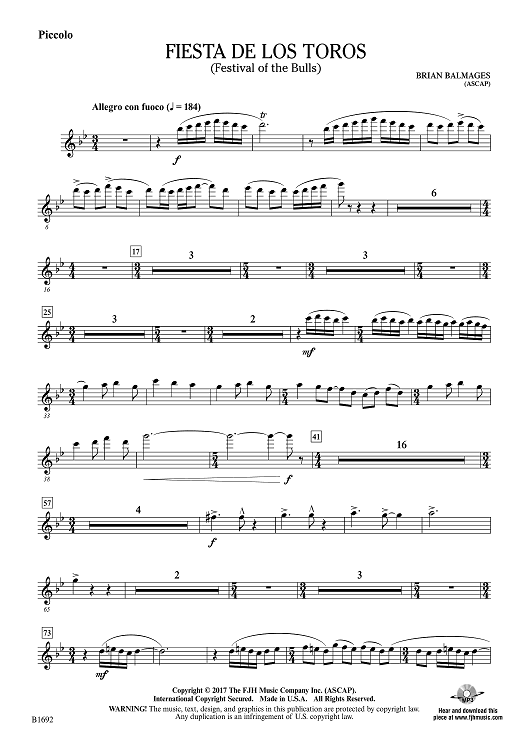 "Fiesta de los Toros - Piccolo" Sheet Music by Brian Balmages