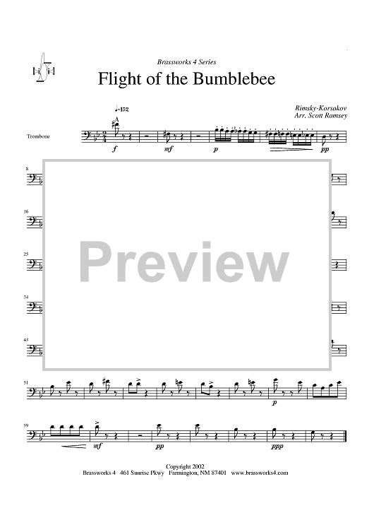Digital Sheet Music for Flight of the Bumblebee - Trombone by Scott A. Ramsey, Nikolai Rimsky-Korsakov scored for Brass Quartet; id:316655