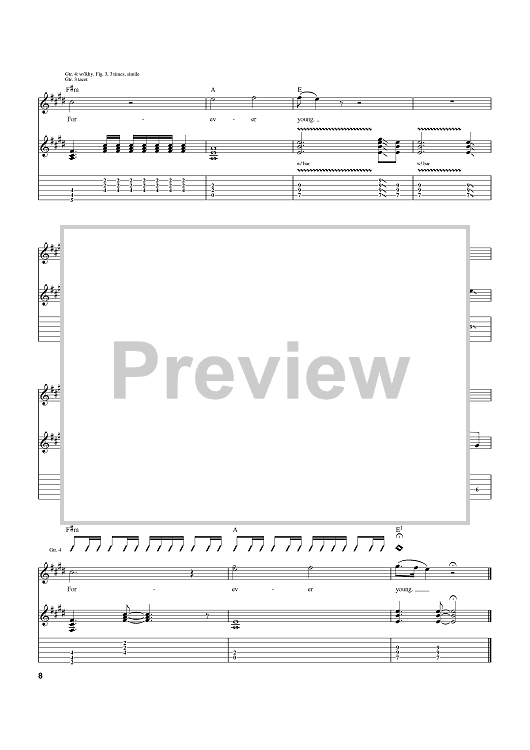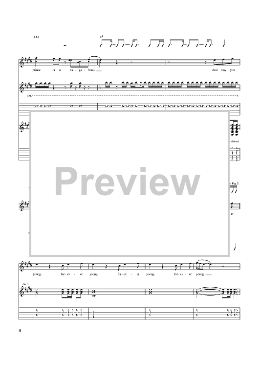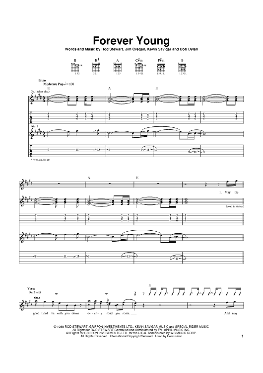 Digital Sheet Music for Forever Young by Bob Dylan, Rod Stewart, Kevin Savigar, Jim Cregan scored for Guitar Tab; id:369729
