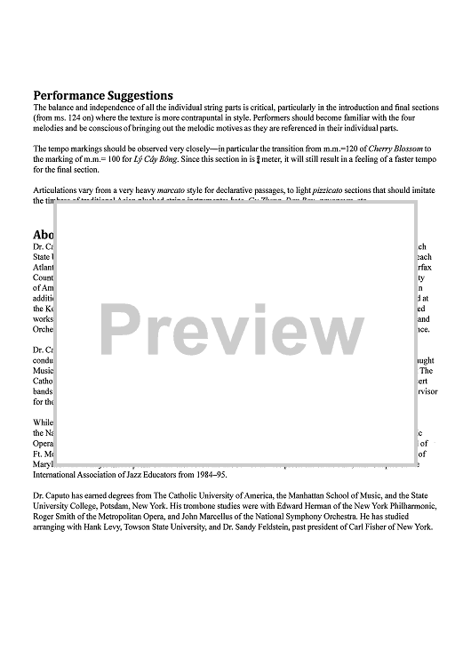 Four traditional songs, from China (Descendant of the Dragon), Japan (Sakura), Korea (Arirang), and Vietnam (Ly Cay Bong) comprise this unique medley. Not only does each section get its thematic moment, but the orchestra also imitates the sounds of traditional Asian instruments. All parts remain in first position, with several tempo and mood changes, from lyric and ethereal to a driving contrapuntal ending. Thorough editorial notes give the history of each song, performance suggestions, and background on the arranger.