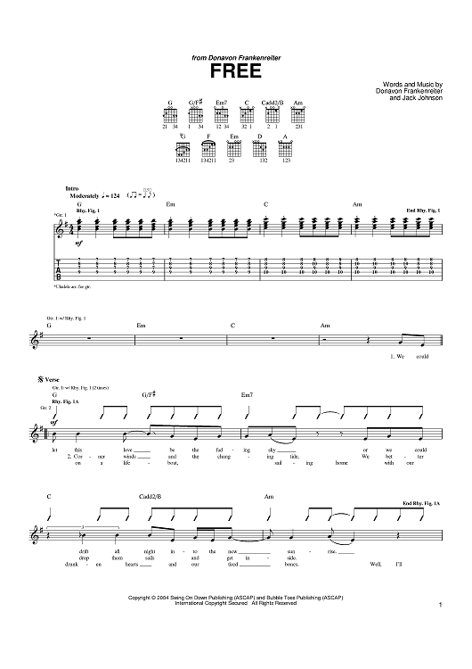 Digital Sheet Music for Free by Donavon Frankenreiter, Jack Johnson scored for Guitar Tab; id:396666