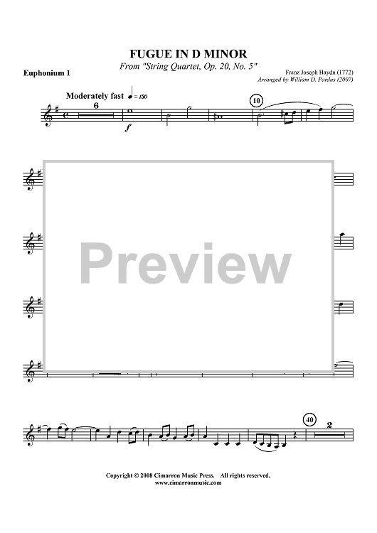 Digital Sheet Music for Fugue in D Minor from "String Quartet, Op. 20 No. 5" - Euphonium 1 BC/TC by Franz Joseph Haydn, William D. Pardus scored for Tuba Quartet; id:413758