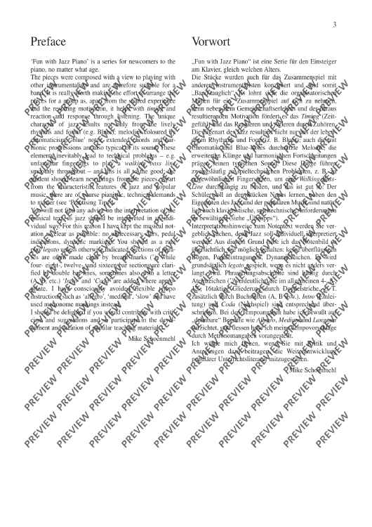 "Fun with Jazz Piano" ist eine Serie für Einsteiger am Klavier, gleich welchen Alters. Sie bietet die Möglichkeit, über das traditionelle Unterrichtsmaterial hinaus, sich mit den Eigenarten der Pop- und Jazzmusik vertraut zu machen. Dabei ist es Mike Schoenmehl wieder einmal gelungen, auch schon mit einfachsten Kompositionen im Vier-(!) und Fünftonraum, stilecht und hinreißend musikalisch, den besonderen Reiz dieser Musikform einzufangen.
