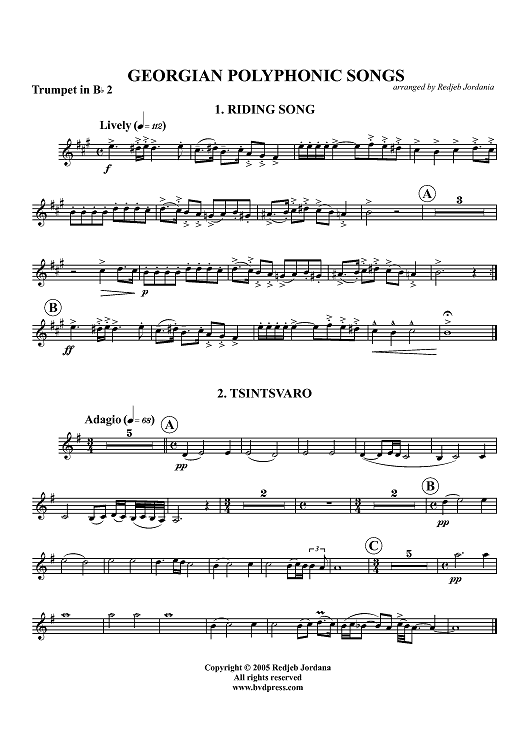 Digital Sheet Music for Georgian Polyphonic Songs - Trumpet 2 in Bb by Various, Redjeb Jordania scored for Brass Quintet; id:428072