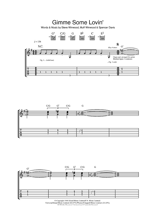 Digital Sheet Music for Gimme Some Lovin' by Steve Winwood, Muff Winwood, Spencer Davis, The Spencer Davis Group scored for Guitar Tab; id:392023