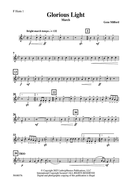 Digital Sheet Music for Glorious Light March - F Horn 1 by Gene Milford scored for Concert Band; id:508971